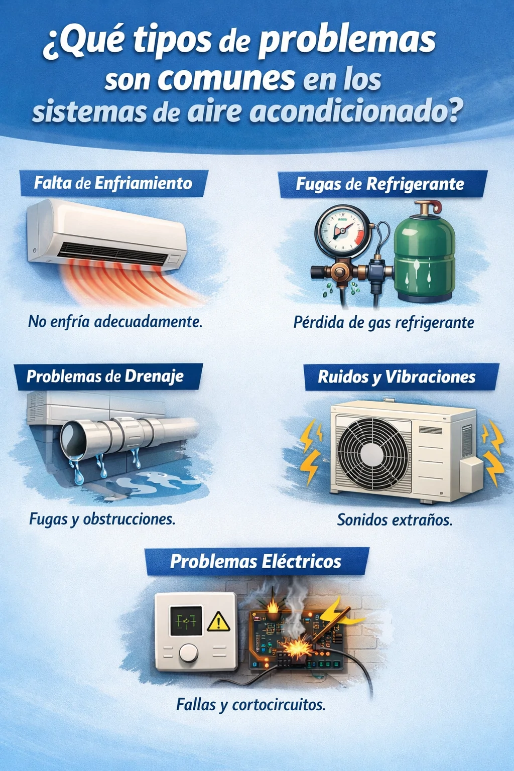 ¿Qué tipos de problemas son comunes en los sistemas de aire acondicionado?
